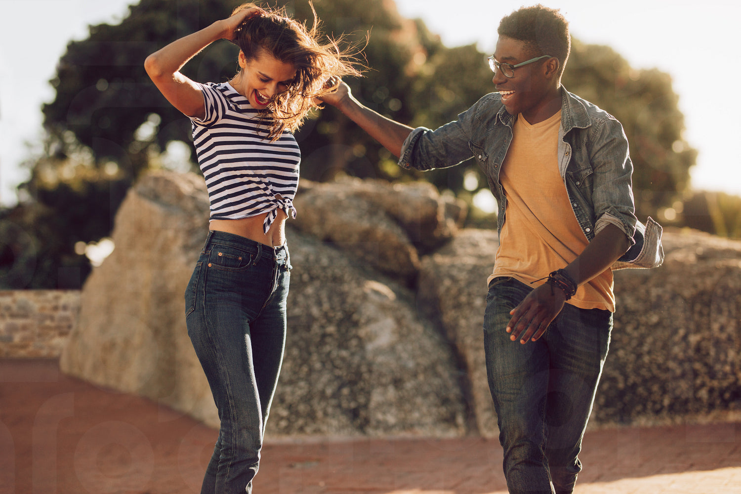 African man with caucasian woman walking outside and laughing. Friends enjoying themselves outdoors.