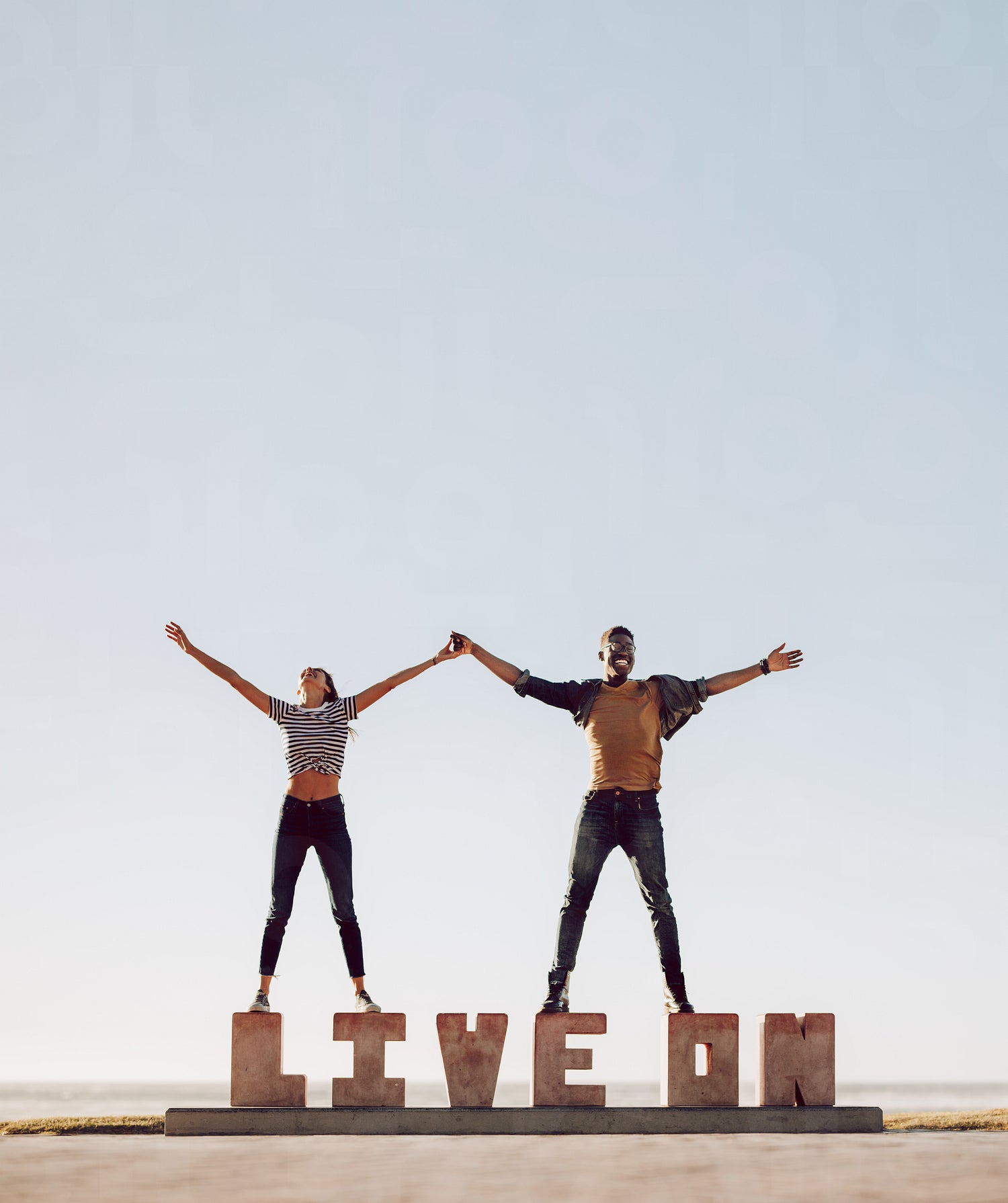Friends standing over a word LIVE ON outdoors with their arms outstretched. Man and woman having a great time together.