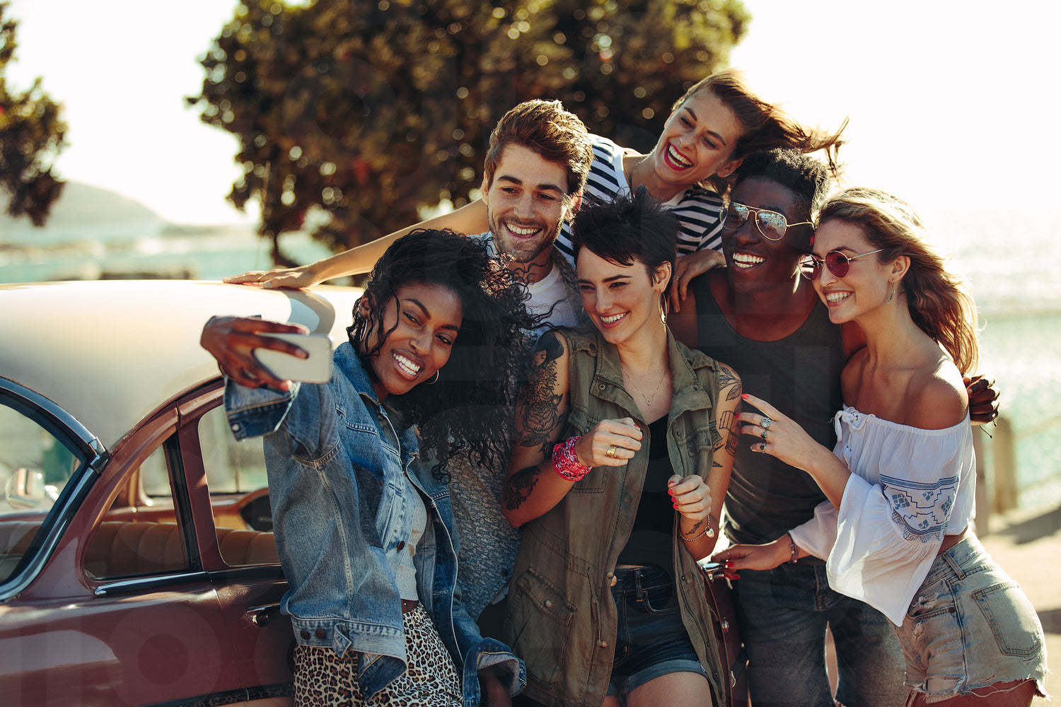 Friends on road trip taking selfie with mobile phone. Group of men and women taking self portrait outdoors by the car.