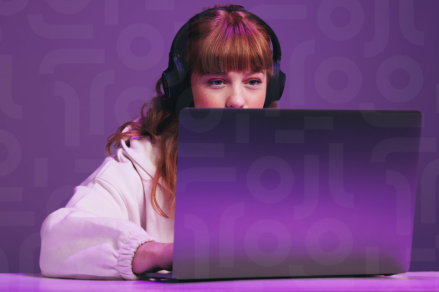 Female gamer looking focused at her laptop screen while playing an online video game in a studio. Woman using an interactive streaming service.