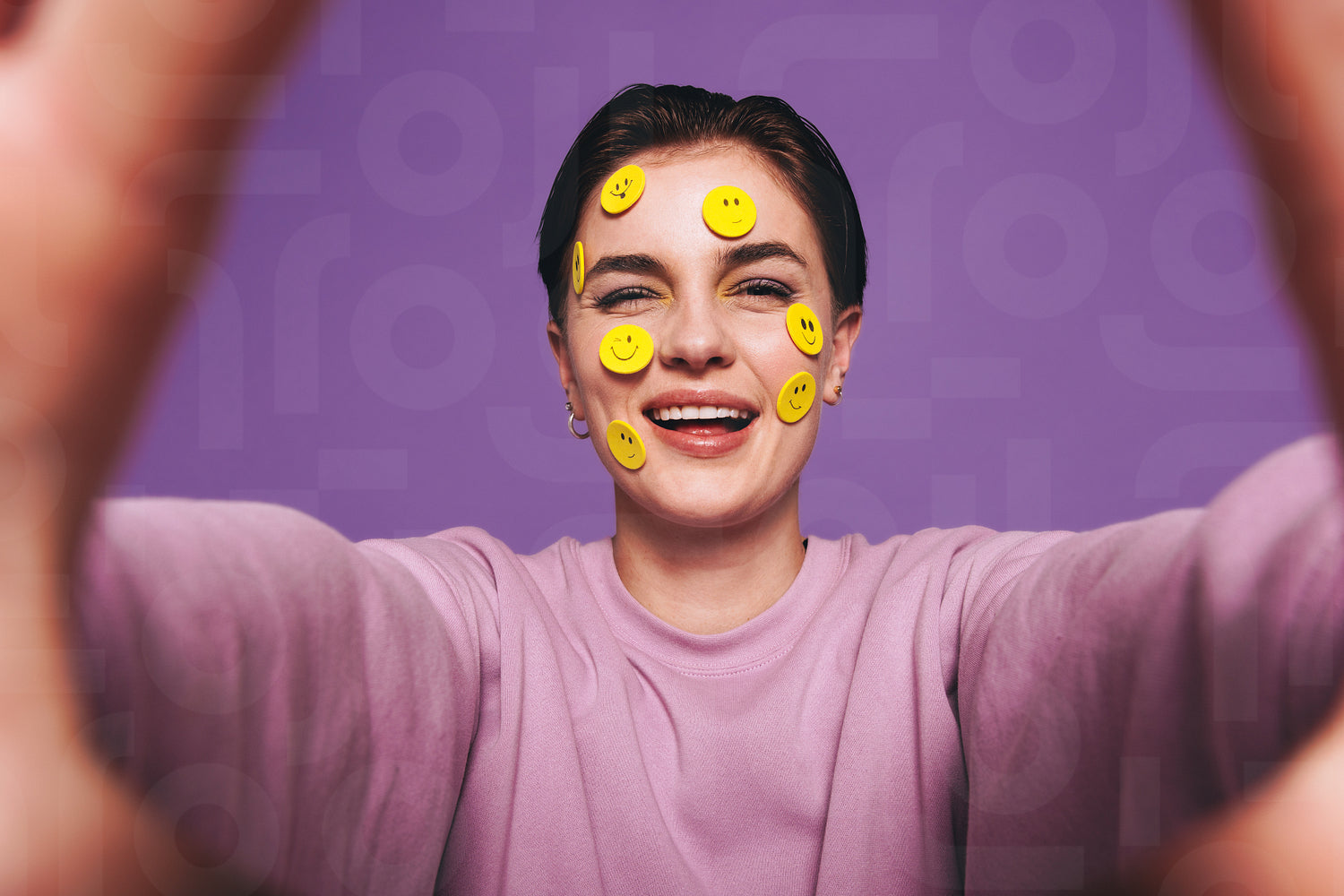 Playful young woman taking a selfie with smiley stickers on her face. Happy woman smiling at the camera while taking a picture of herself. Cheerful young woman having fun against a purple background.