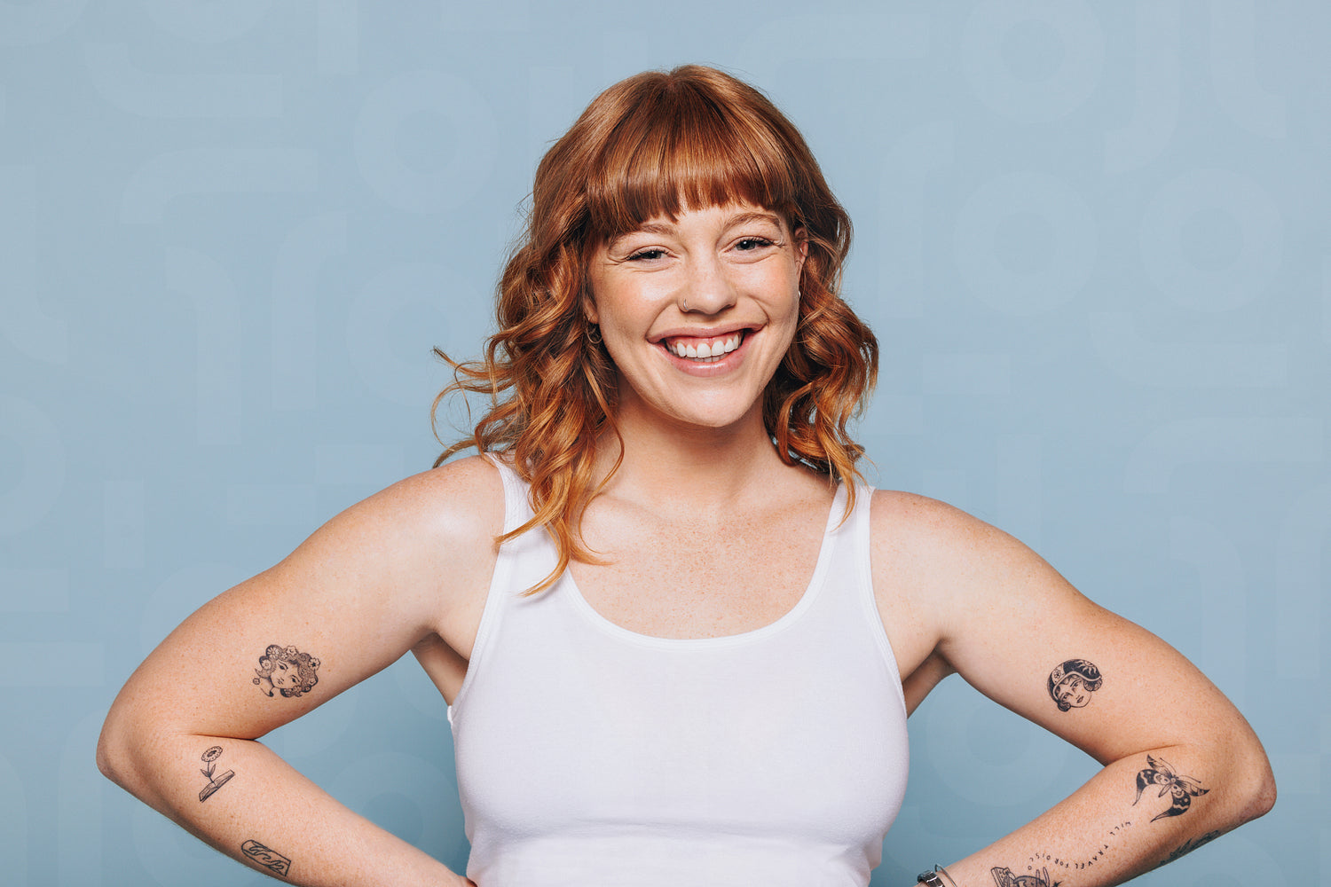 Portrait of a happy young woman with arm tattoos standing in a studio. Cheerful young woman with ginger hair standing against a blue background in a white tank top.