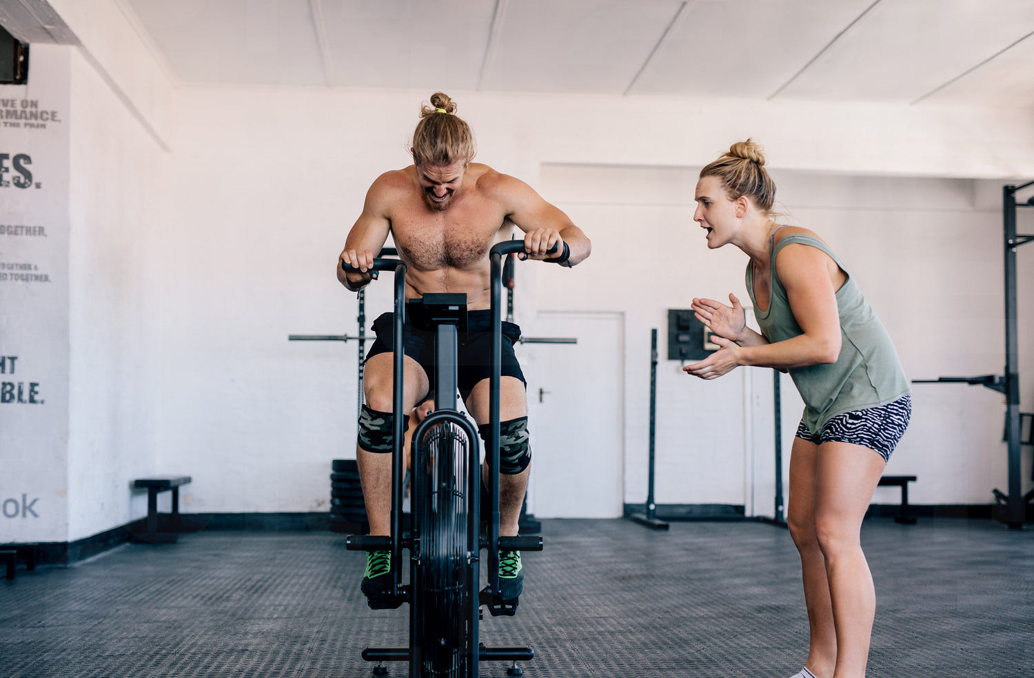 Personal trainer motivating man while exercising on stationary bike in gym. Man doing intense workout on gym bike with female coach.