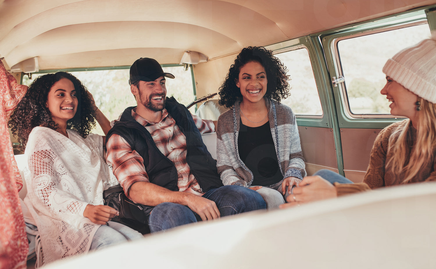 Multiethnic friends on roadtrip travelling together in a van. Group of man and women sitting inside a van and laughing.