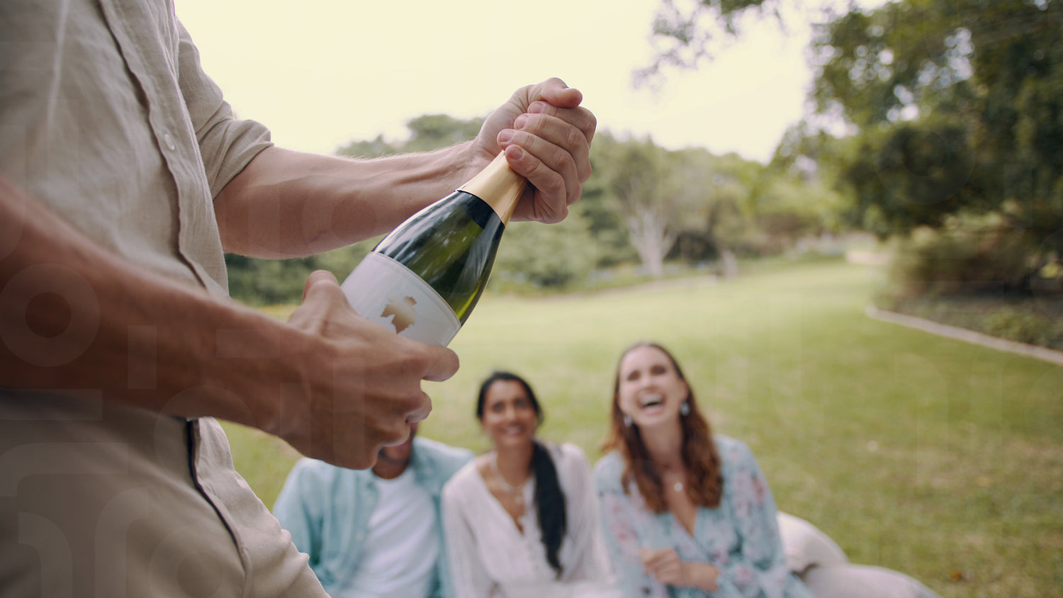 Man opening champagne bottle and pouring it in the glass of a woman. Group of friends having champagne on picnic.