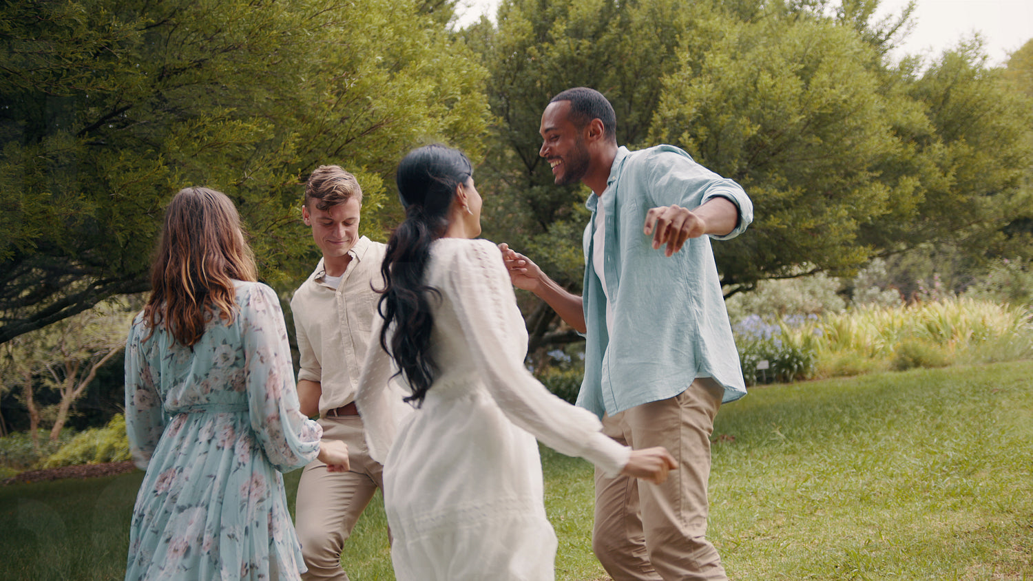 Group of men and women dancing together on a picnic. Multi ethnic friends enjoying a summer weekend at the park.