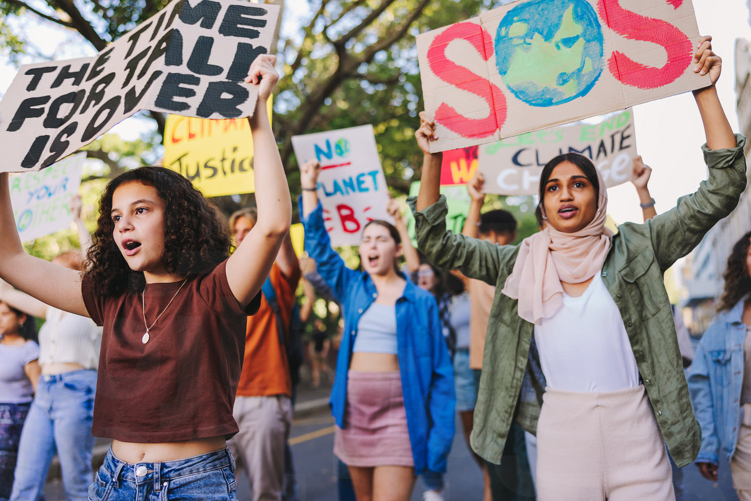 Group of youth activists standing up against climate change and global warming. Multicultural young people protesting with posters and banners. Diverse teenagers joining the global climate strike.
