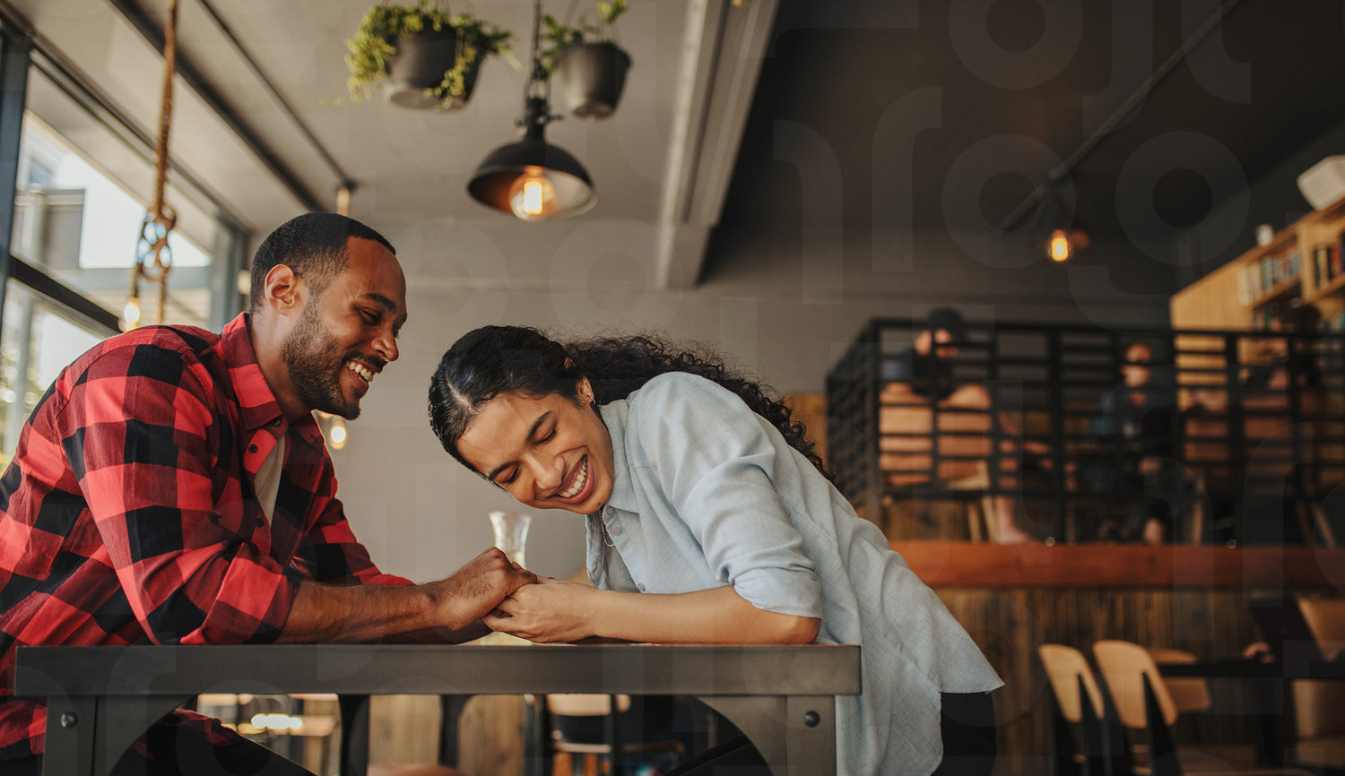 Smiling man and woman sitting at a coffee shop holding hand. Couple in love sitting in cafe smiling and having a great time together.