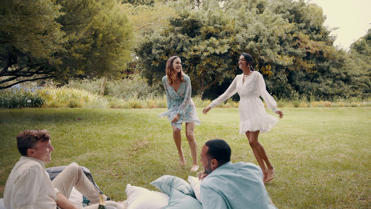 Friends spending weekend in the park and having fun. Multi-ethnic people enjoying dancing on a picnic at the park.