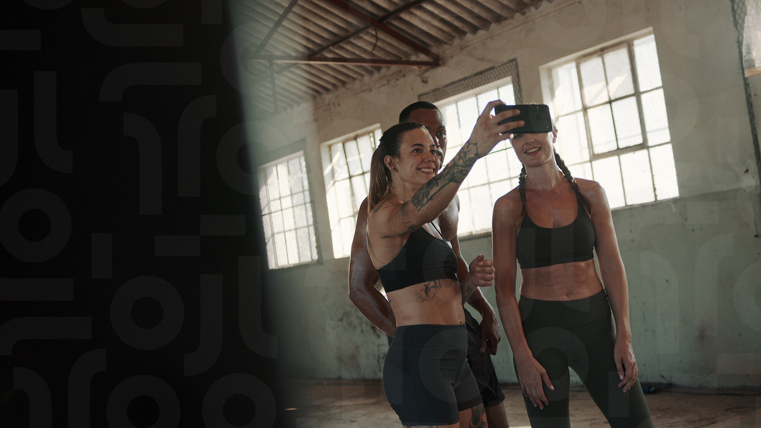 Smiling young people taking self portrait with mobile phone in gym. Friends in fitness studio taking selfie with smart phone after workout session.