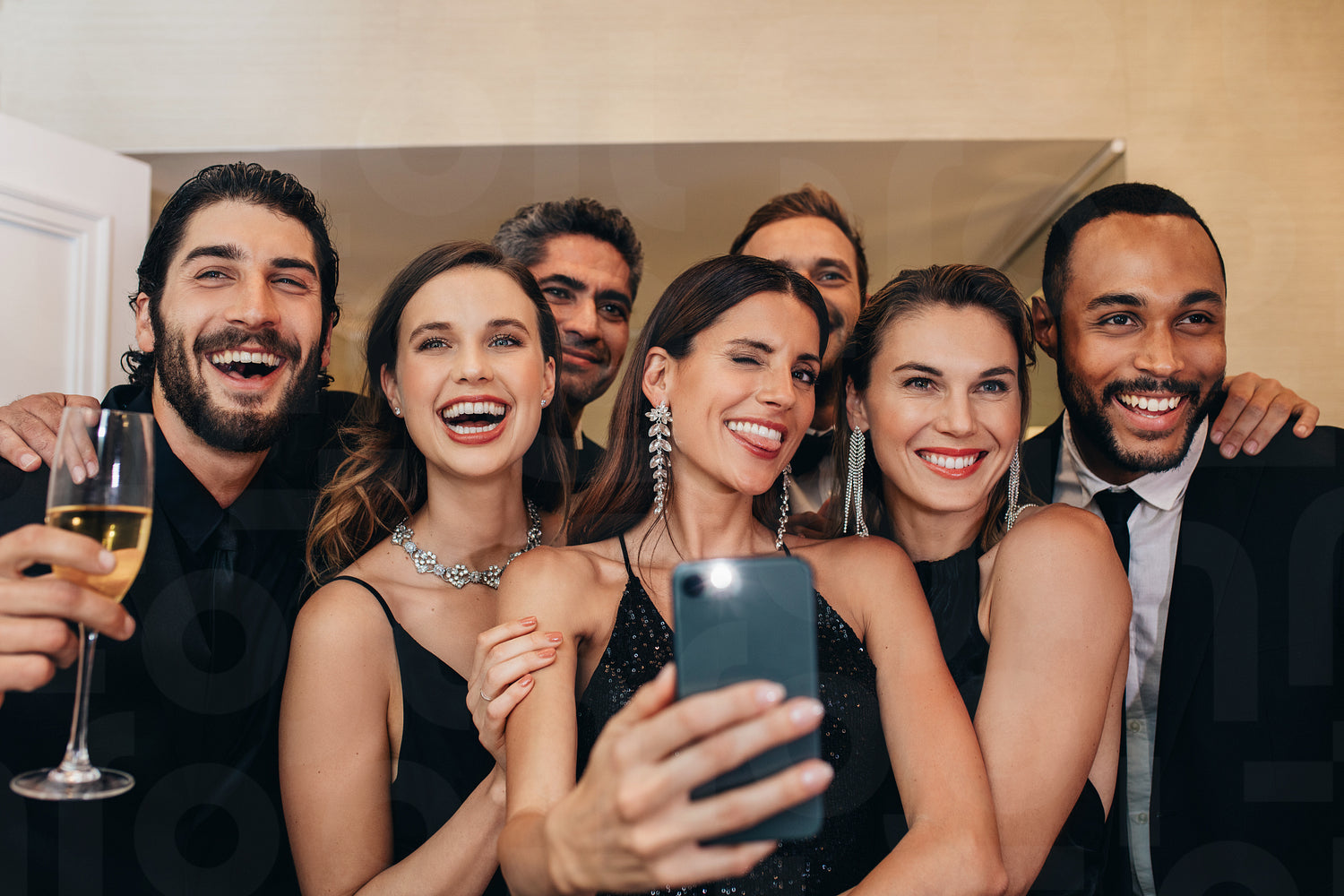 Smiling woman with friends taking selfie at a party. Diverse group of socialites taking a selfie at a party.