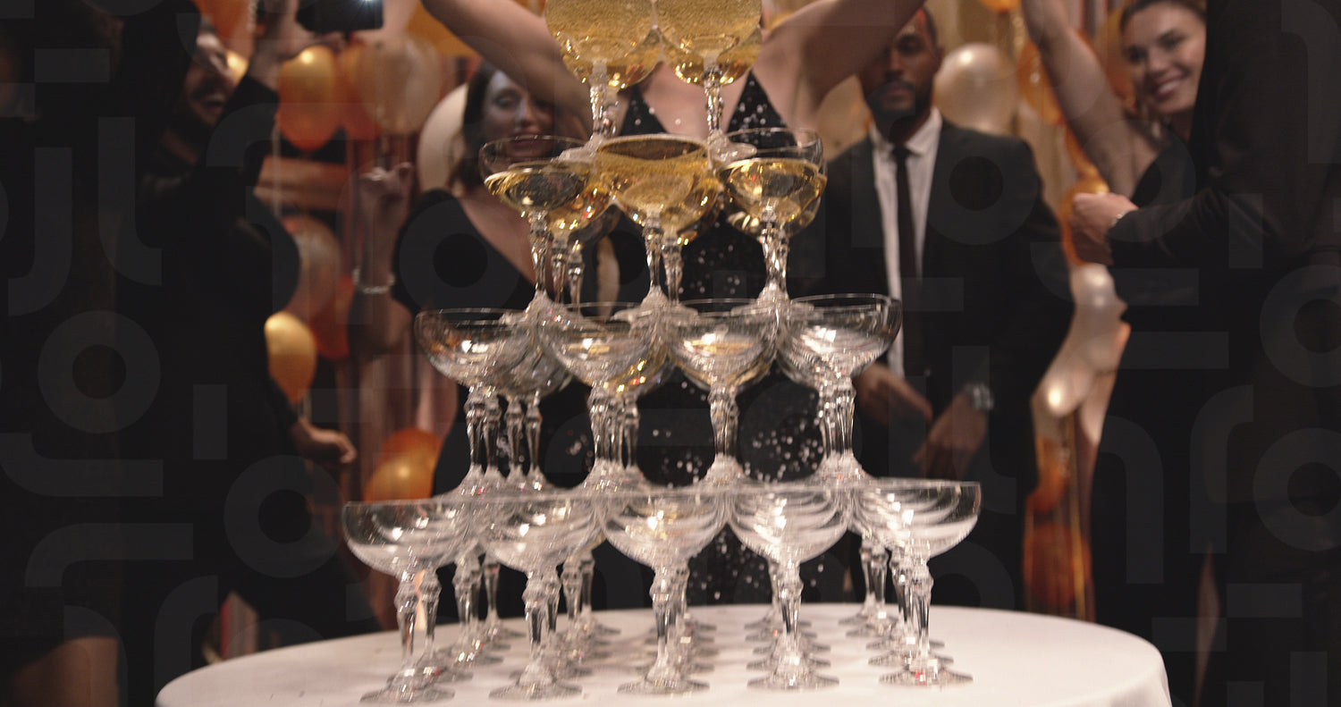 Excited young Woman filling champagne into a tower glasses with friends dancing around and shooting a film on their mobile phone at gala night party. Group of people enjoying at new years party.