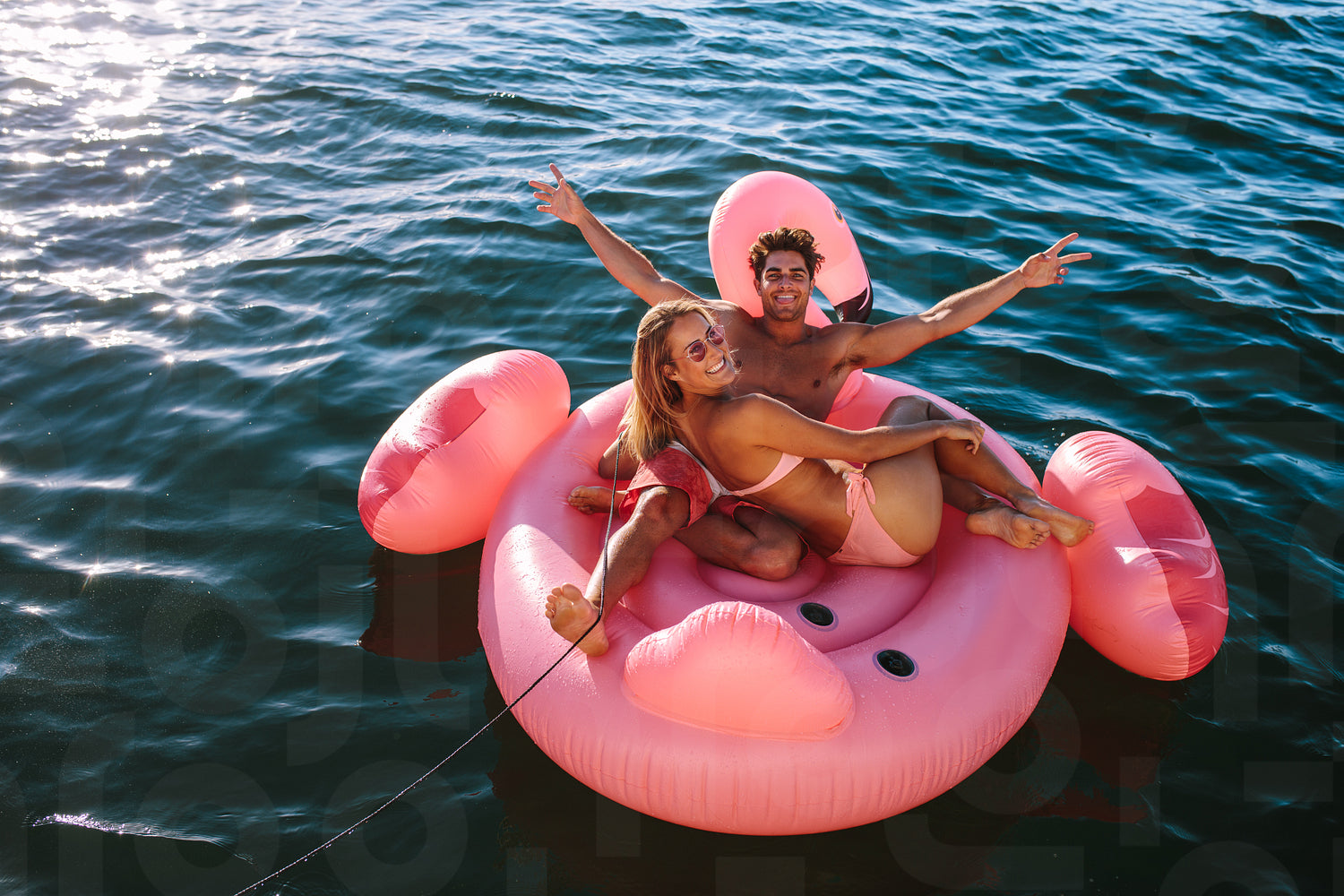 Attractive couple enjoying inflatable toy ride behind a boat in the sea. Man and woman sitting on a inflatable toy tied to a boat in sea.