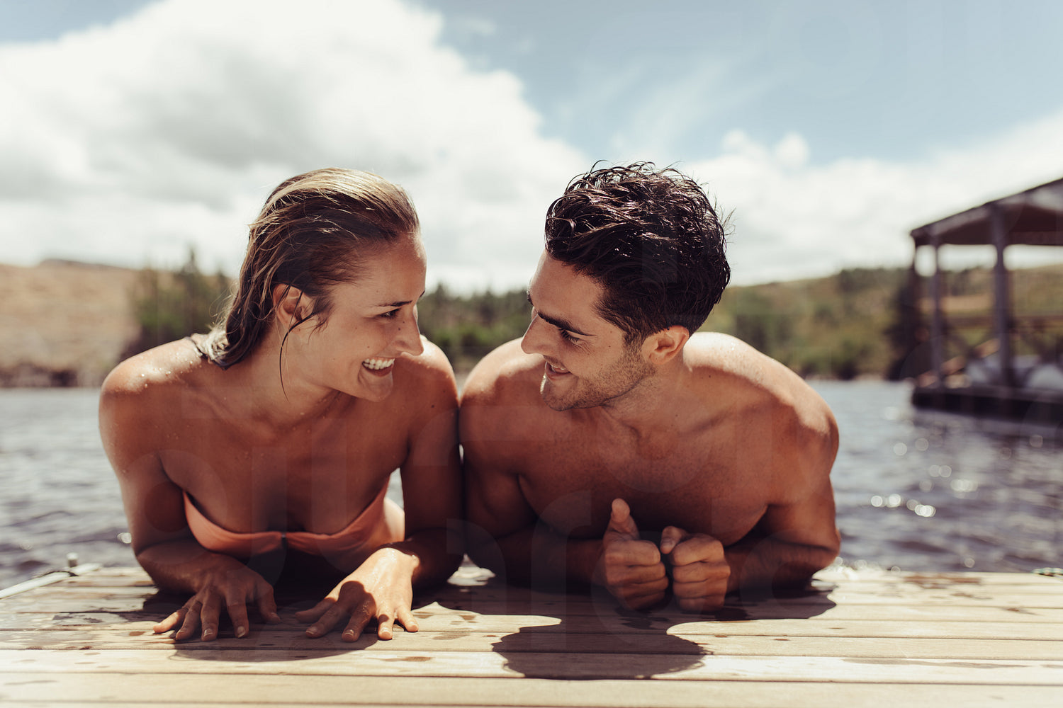 Portrait of happy young couple hanging on pier by the lake looking at each other and smiling. Young man and woman on wooden jetty after a swim in lake.
