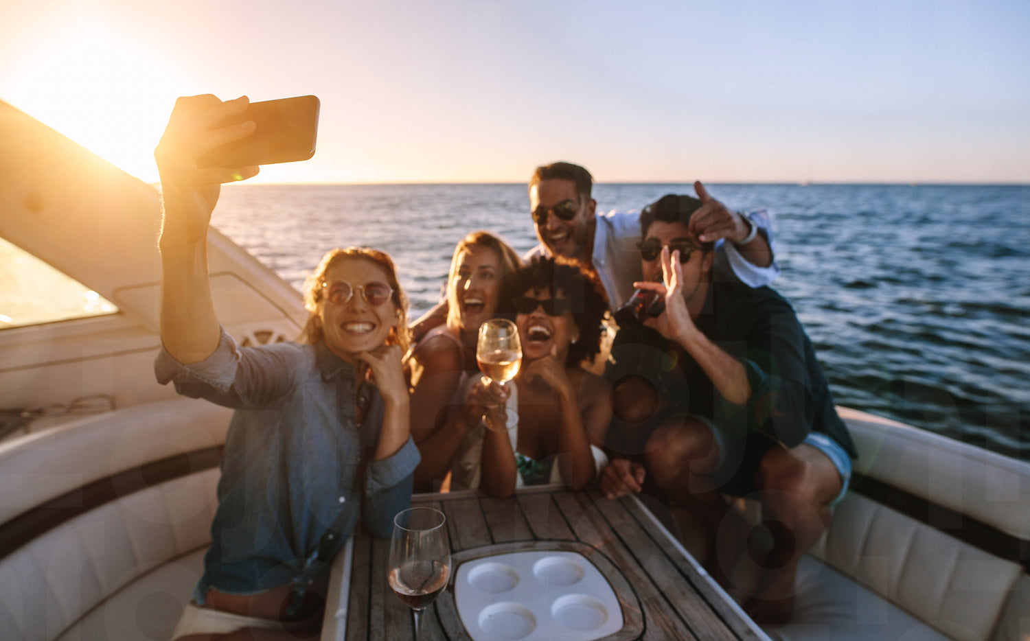 Cheerful young people posing for a selfie at boat party. Crazy friends enjoying a party on private yacht and taking selfie.
