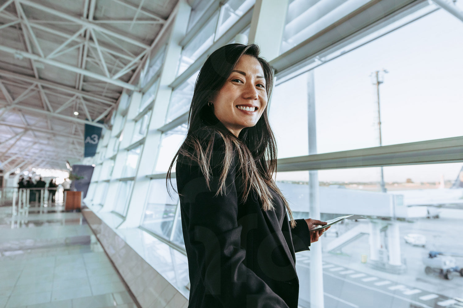 Woman at airport waiting to board airplane