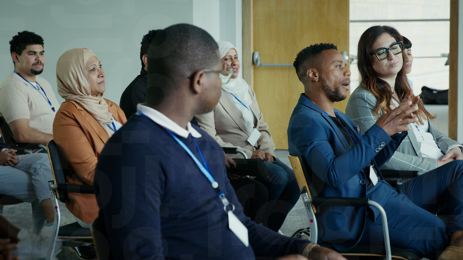 A diverse group of attentive professionals and business people are actively participating in a conference. They are seated, engaged, and focused on learning and networking at a professional event.