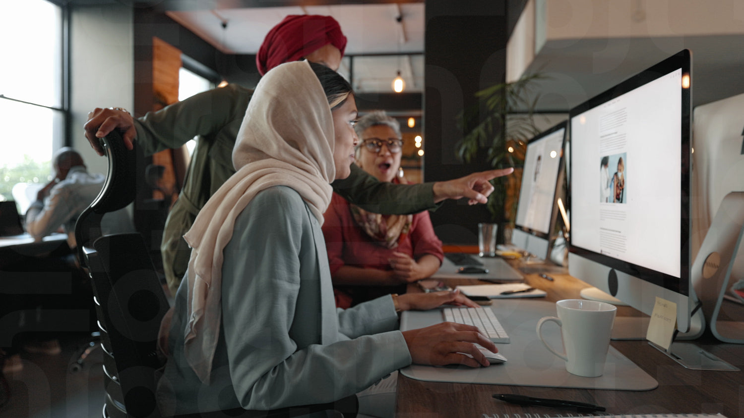 Female business team collaborating on a marketing campaign in an inclusive coworking office. Group of multicultural women engaging in a discussion around a computer, brainstorming ideas for their project.