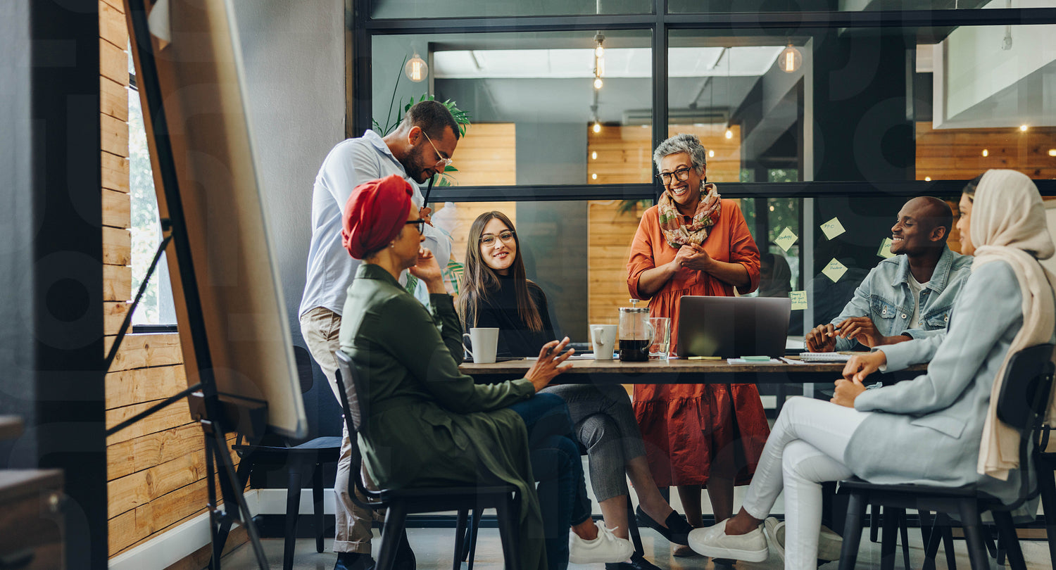 Happy businesspeople smiling cheerfully during a meeting in a creative office. Group of successful business professionals working as a team in a multicultural workplace.
