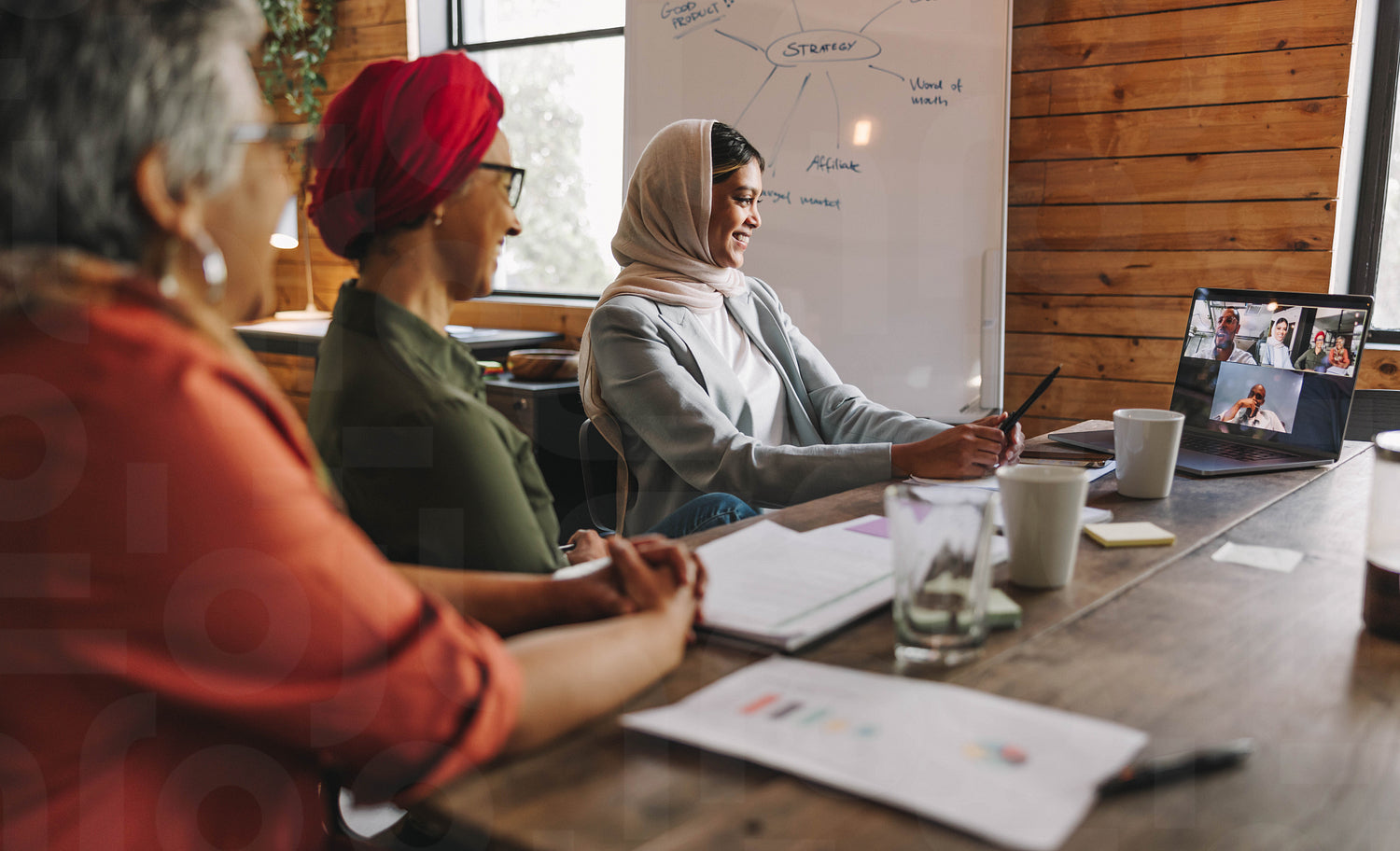 Happy female entrepreneurs attending an online meeting with their business partners. Group of multicultural businesswomen having a video conference in a creative workplace.