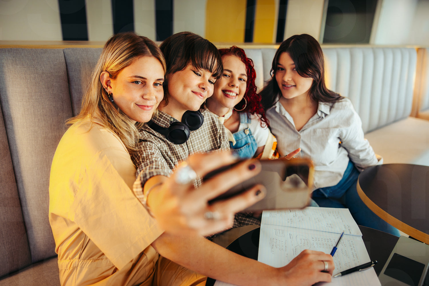 Group of friends taking a selfie in a classroom setting to capture special friendship moments and student life adventures