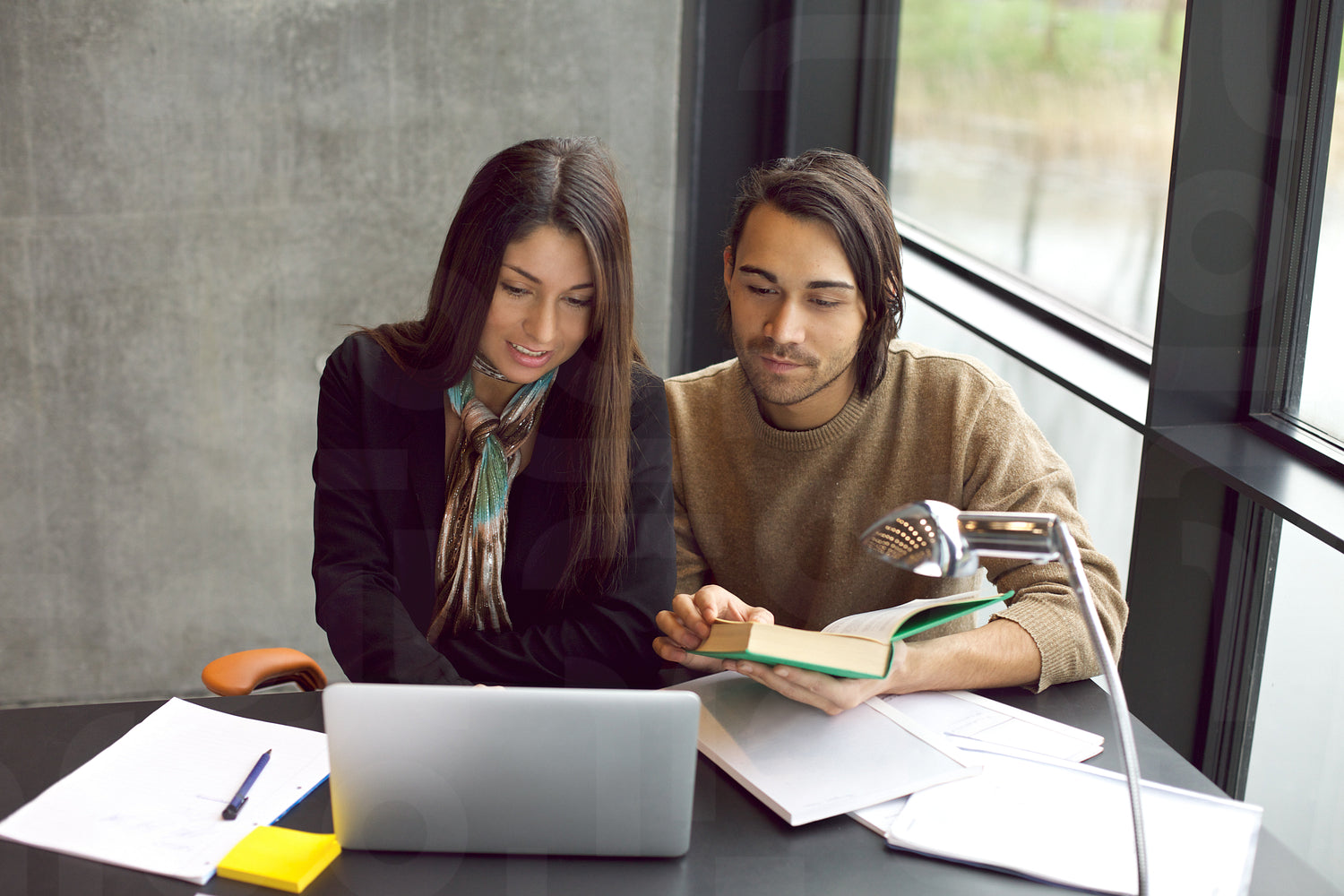 Young man and woman with laptop and book preparing for exams. University students working hard for final exams in library.