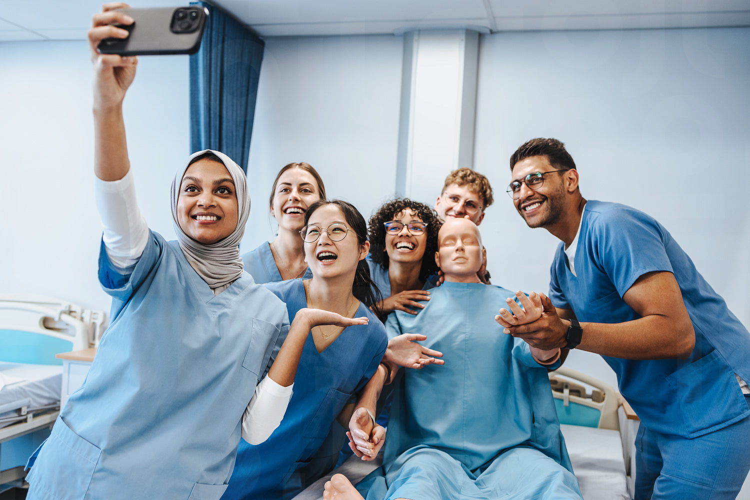 Celebrating a successful training: Diverse nursing class takes selfie with a dummy in simulation centre