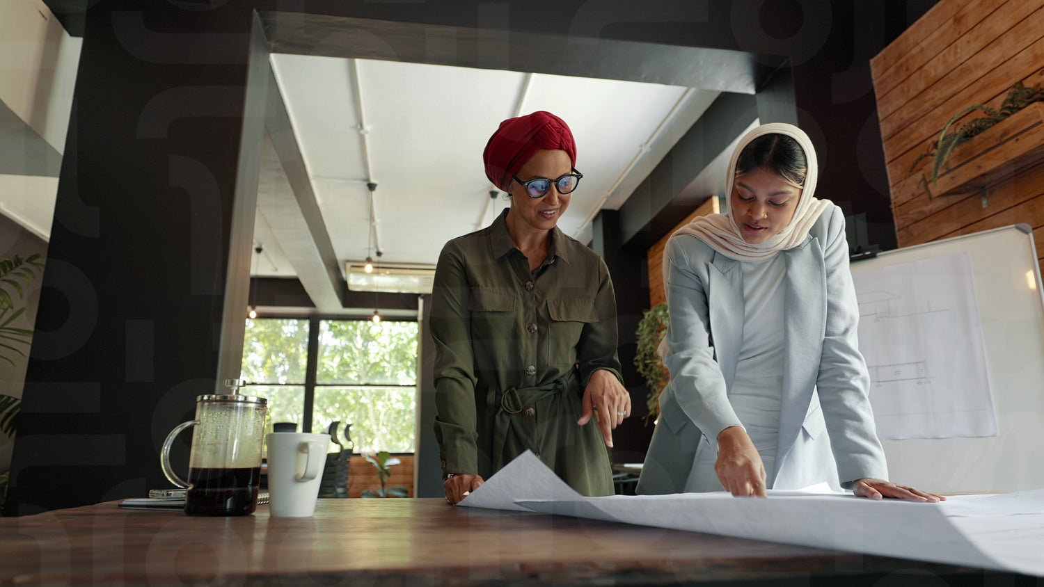 Women wearing headscarves discuss and share ideas as they work on the planning and designing phase of a building project. Two female architects reviewing blueprint drawings for a floor plan.