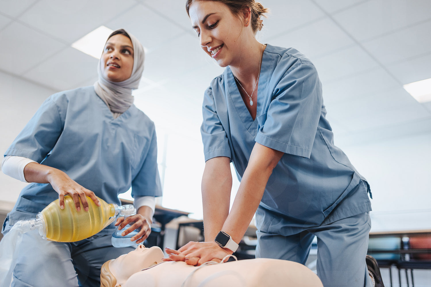 Female student doctors practice CPR on a medical simulator, they perform chest compressions and place a self inflating bag on the dummy. Students undergoing training in a healthcare simulation centre.