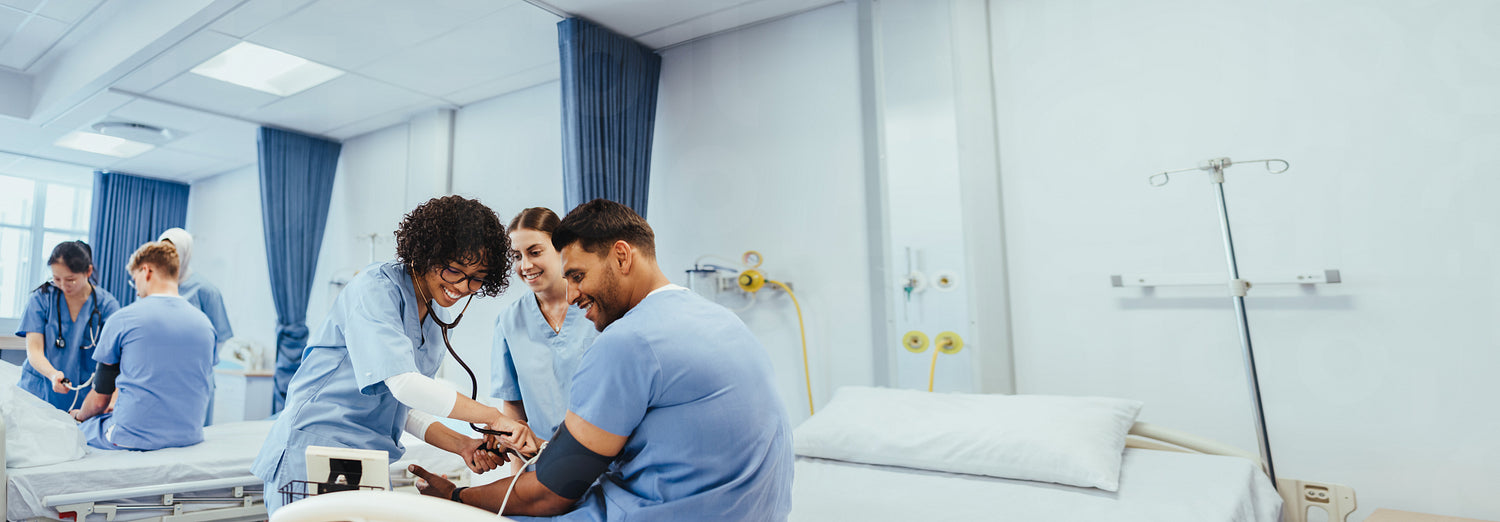 Hands on medical training in a hospital as students learn how to check blood pressure