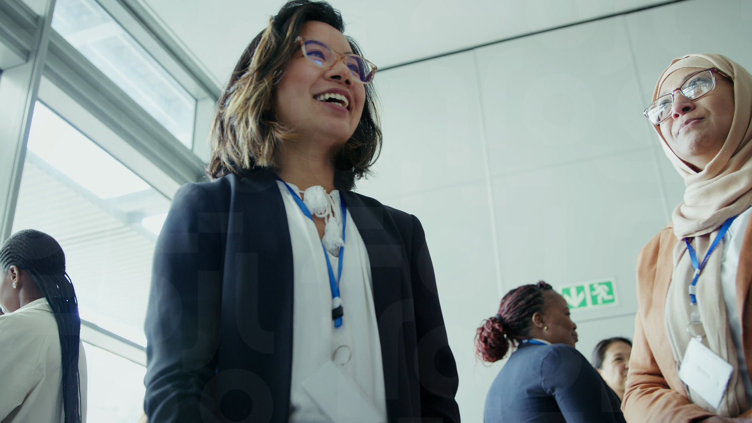 Group of diverse professional women engaged in discussion and networking at a business conference. They are smiling and actively participating in the event.