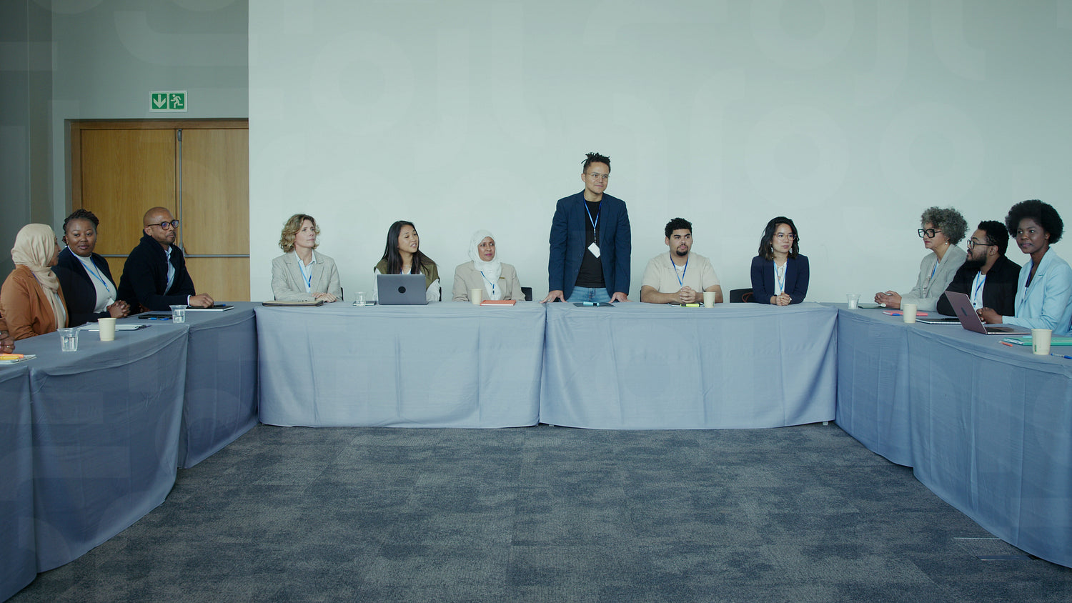 Diverse business professionals collaborate in a corporate conference, engaging in discussions and sharing ideas. This inclusive meeting showcases teamwork and global partnership.
