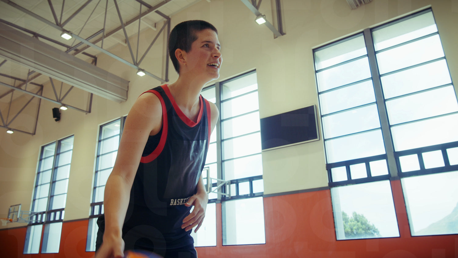 A young, short-haired person, wearing a black and red jersey, practices basketball on an indoor court. They dribble and then shoot the ball, showing dedication and skill.