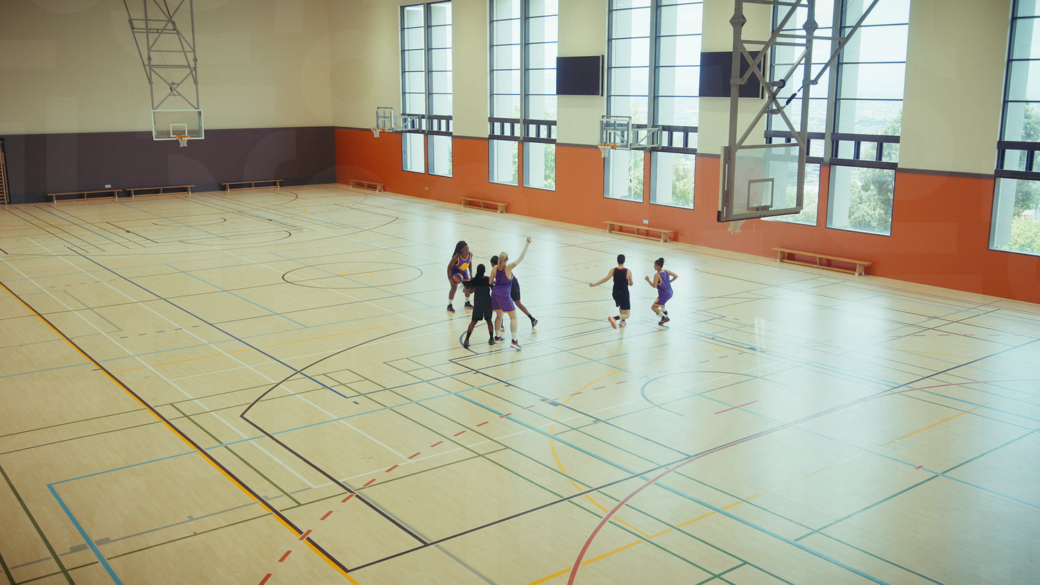 Young athletes dribble and pass a basketball during an energetic practice session on a modern indoor court. The team shows focus and determination while playing their sport.