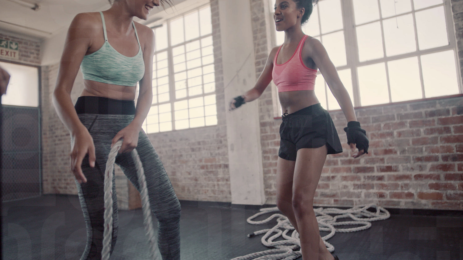 Three women giving high five in gym after successful training session. Happy young girls taking break after intense workout session in fitness studio.