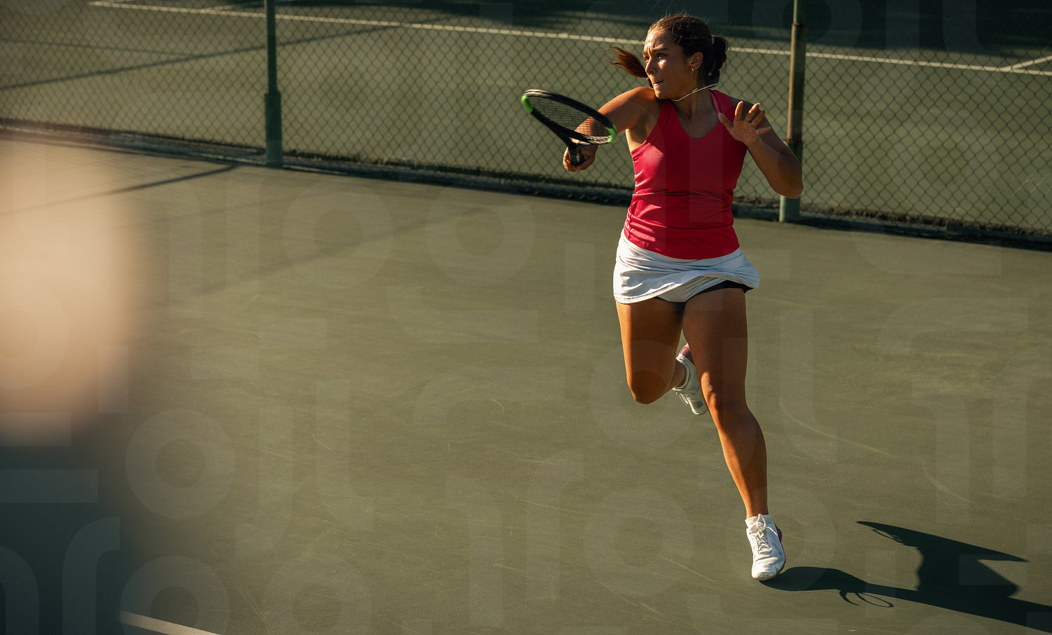 Female tennis player hitting powerful forehand during training session on outdoor court
