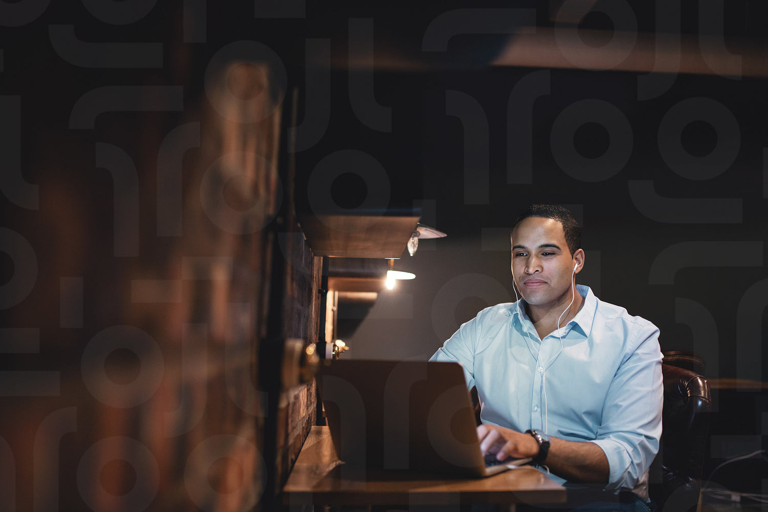 Young man working at the laptop late at night. African businessman working overtime in the office.