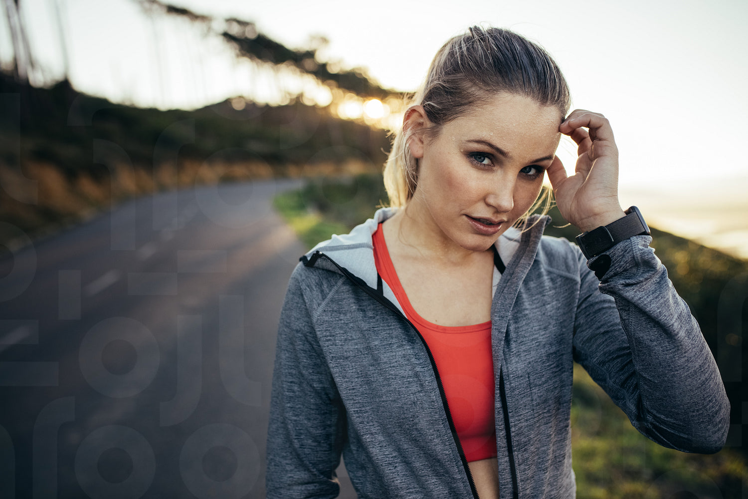 Portrait of a female athlete standing on street during her morning fitness training. Woman in fitness wear walking on an empty street in the morning.