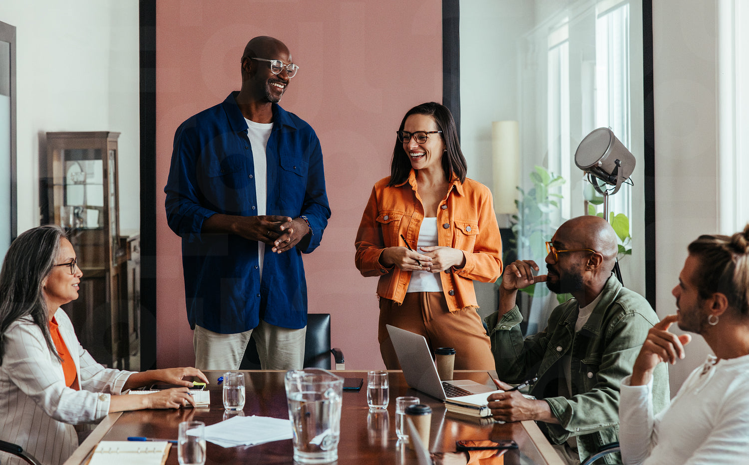 Business team meeting in a boardroom with co-workers collaborating and sharing ideas. Teamwork and creative brainstorming in a professional setting.