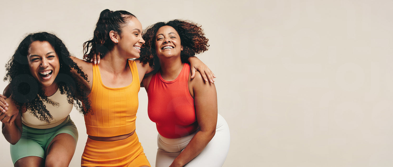 Three women in colorful activewear embracing and laughing together in a bright studio. Concept of fitness, wellness, body positivity, and an empowering active lifestyle.