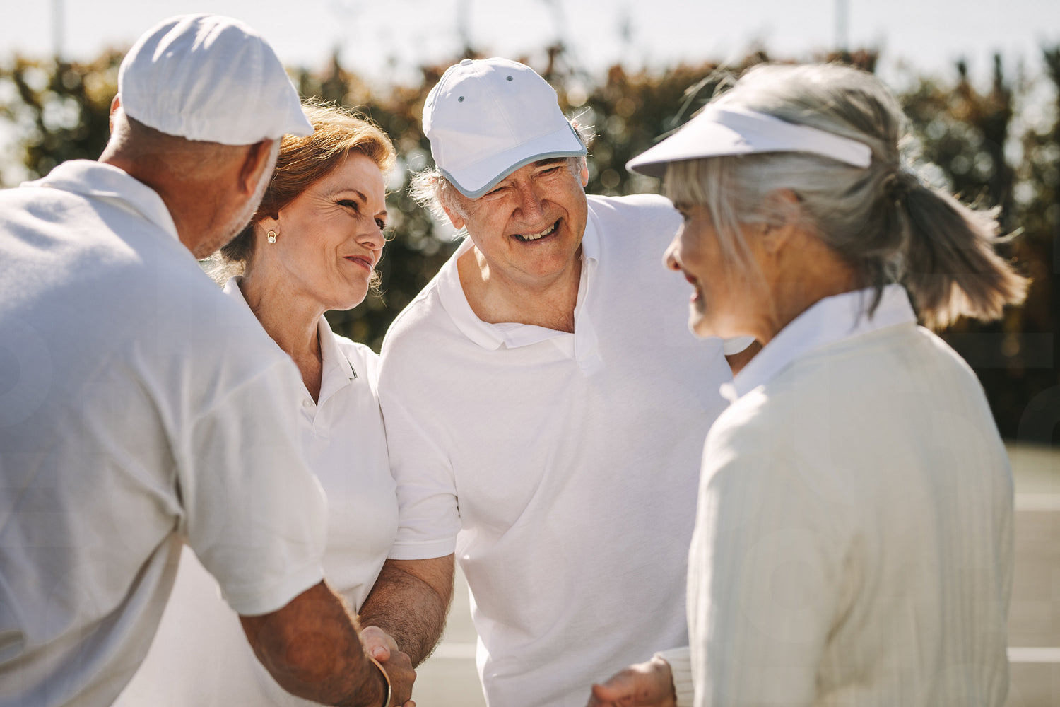 Smiling couples exchange greetings after a game of tennis. Senior greeting each other after a mixed doubles tennis match.