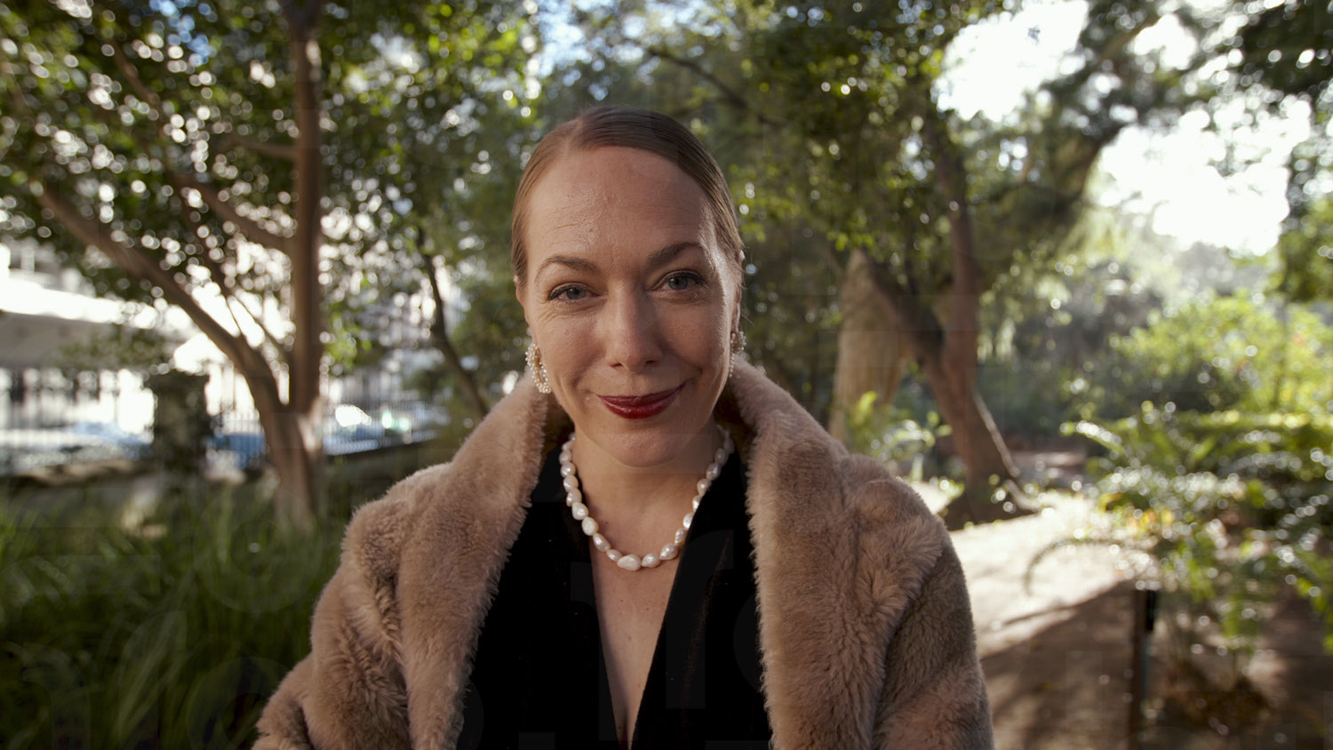 Portrait of a wealthy woman looking at camera and smiling. Rich senior woman with makeup, jewelry and fur jacket in the park.
