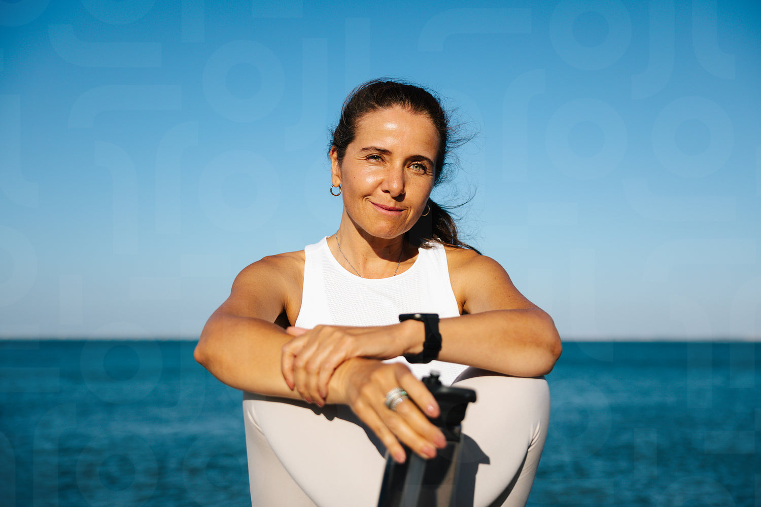 Confident woman exercising outdoors on a sunny day with the ocean in the background