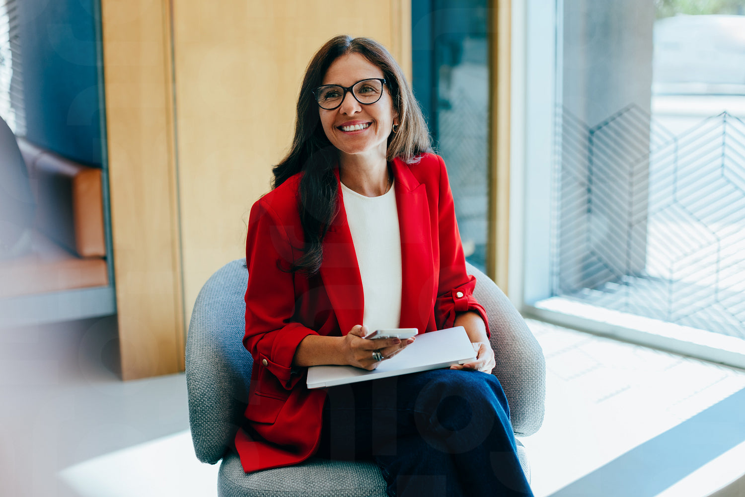 Confident woman wearing red blazer smiling while sitting in a bright office