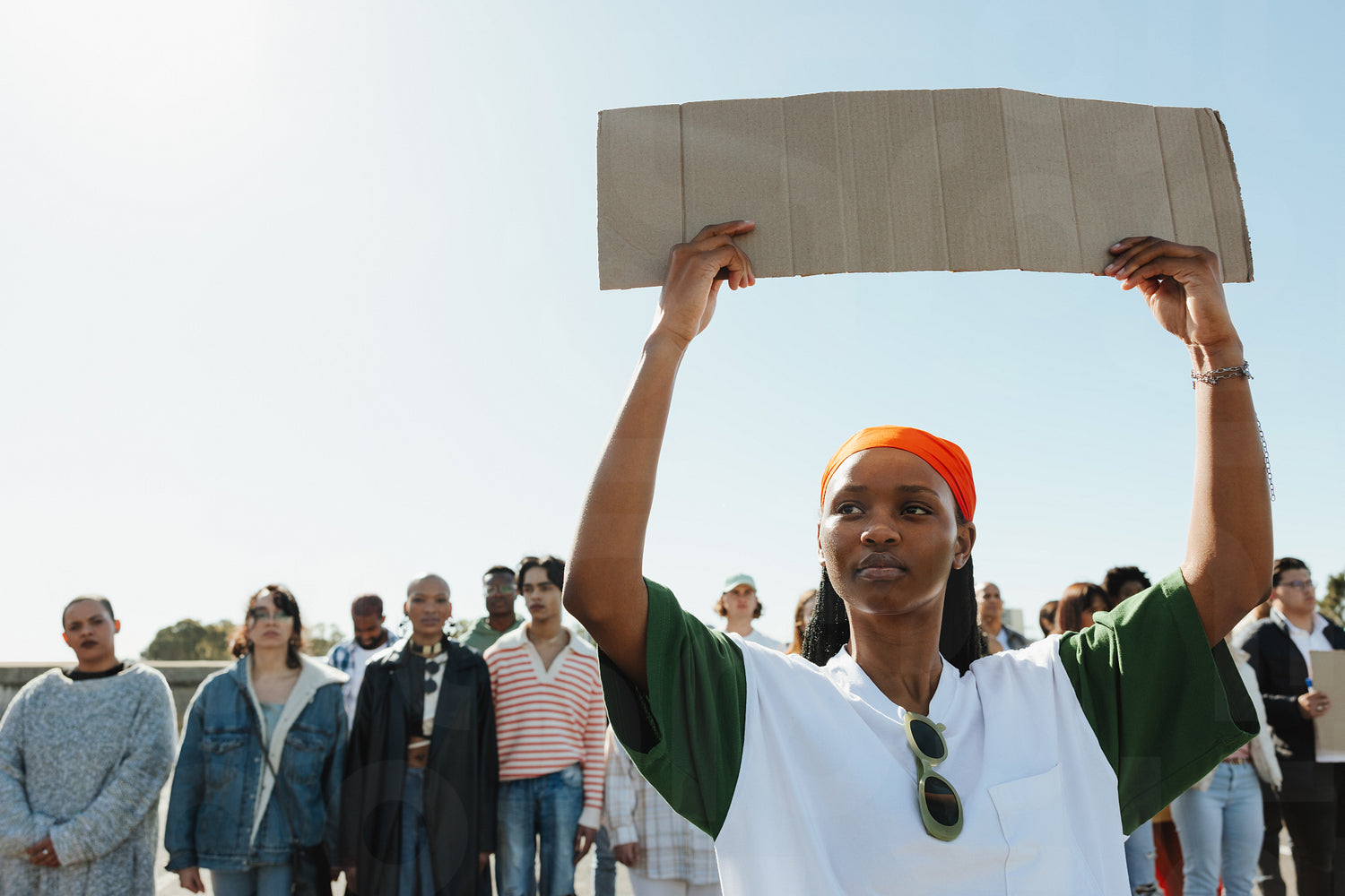 A group of protestors gathered outdoors, with a woman holding up a blank cardboard sign, symbolizing advocacy and expression for a cause, set against a sunny sky backdrop.