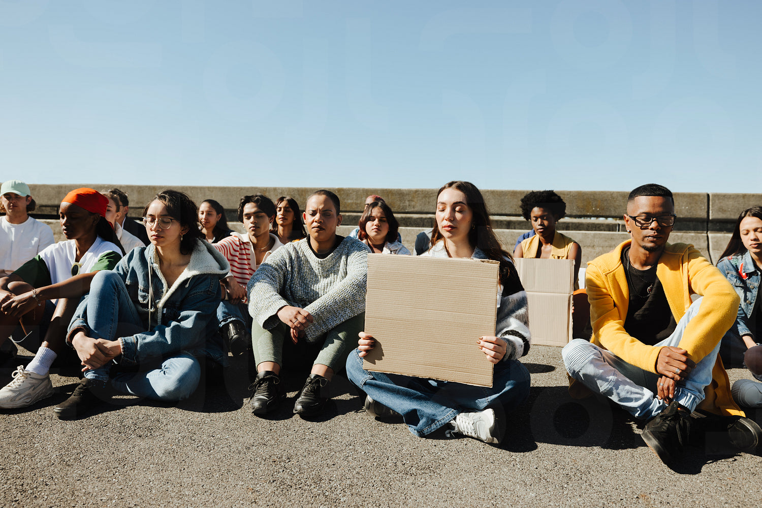 A group of young individuals seated outdoors holding signs during a peaceful protest. Clear blue sky and casual attire reflect the unity, diversity, and collective action.