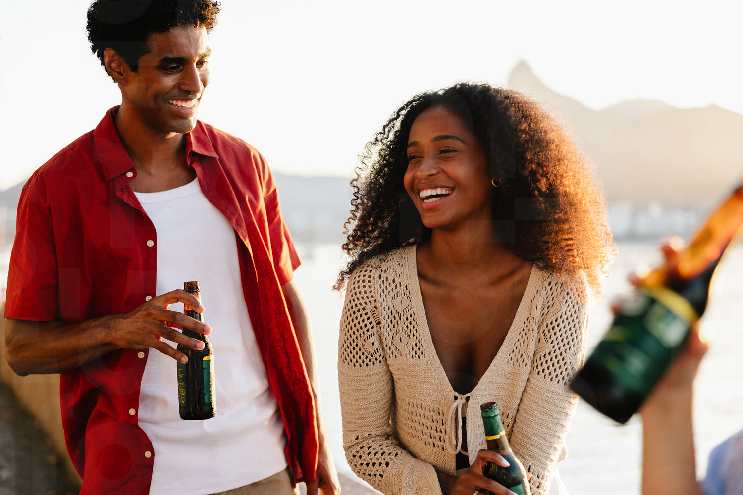 Joyful friends celebrating outdoors with drinks at sunset in Brazil