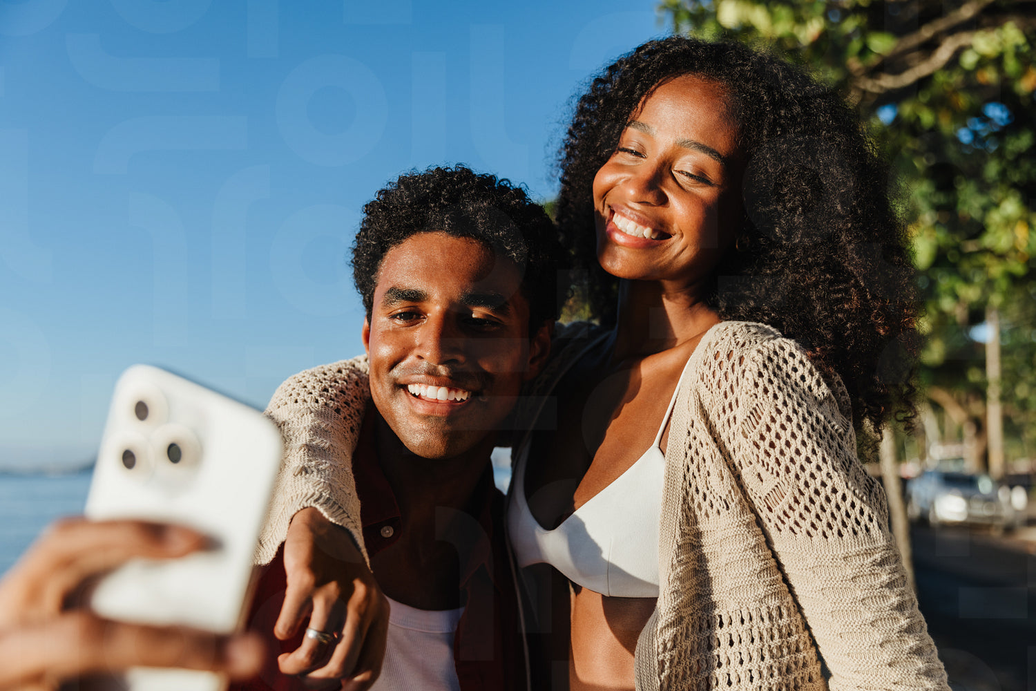 A cheerful young couple captures a joyful selfie together outdoors in Brazil. They are smiling brightly under the sun, showcasing a moment of happiness and connection against a natural backdrop.