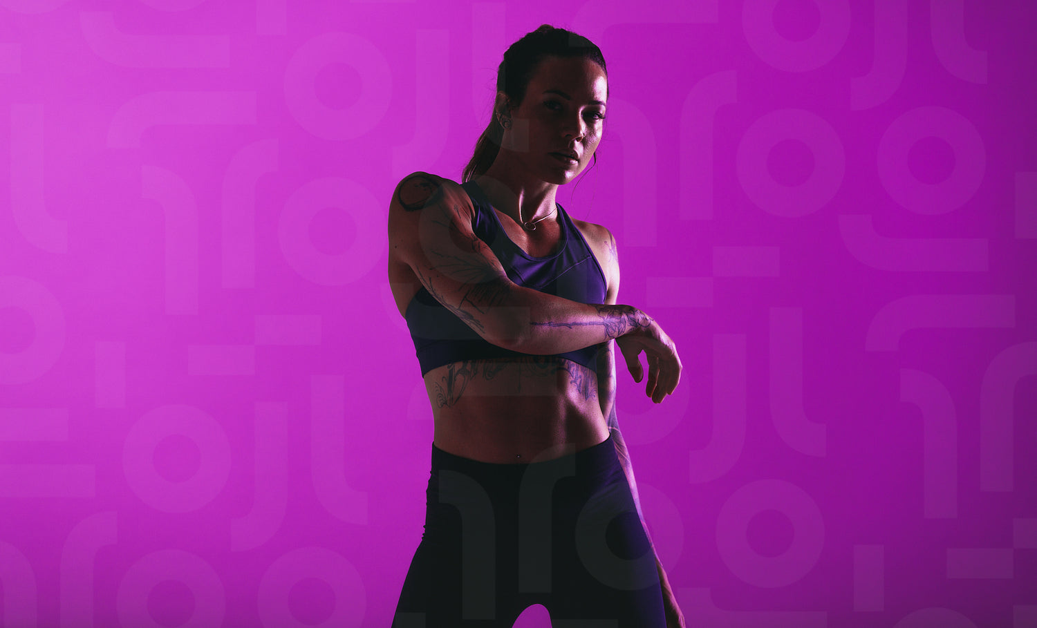 Portrait of fitness woman working out on purple background. Woman in fitness wear doing exercise.