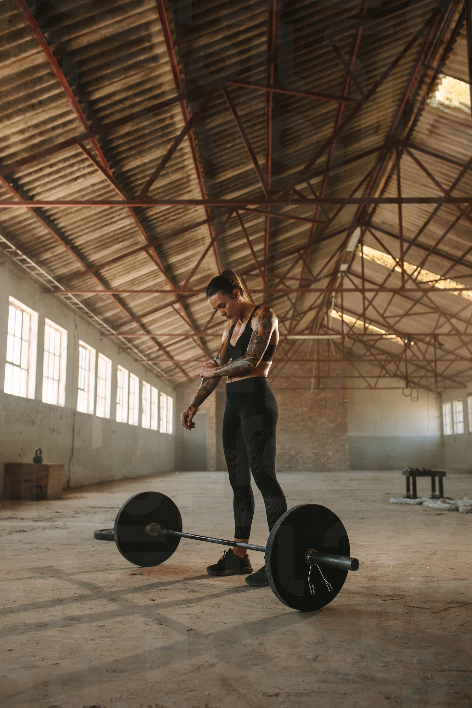 Muscular woman standing at gym with barbell on floor. Strong fitness female at gym inside old warehouse.